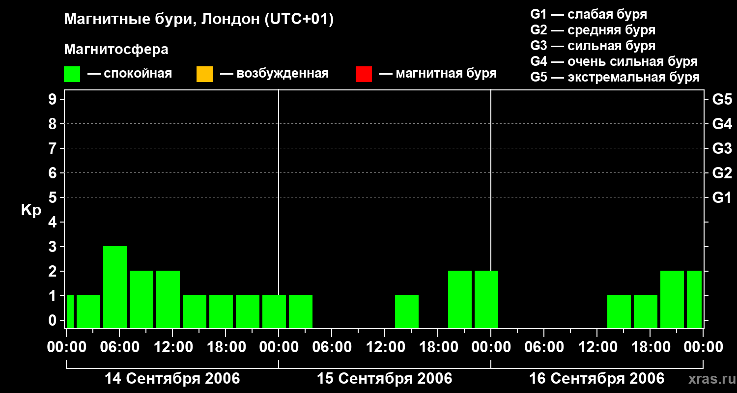 Изменения геомагнитного индекса Kp с 14 по 16 сентября 2006 года для средних широт