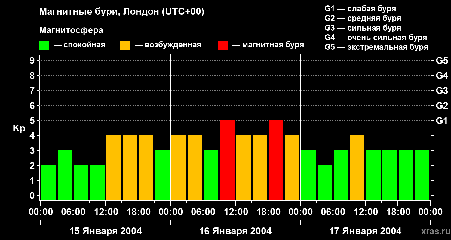 Изменения геомагнитного индекса Kp с 15 по 17 января 2004 года для средних широт