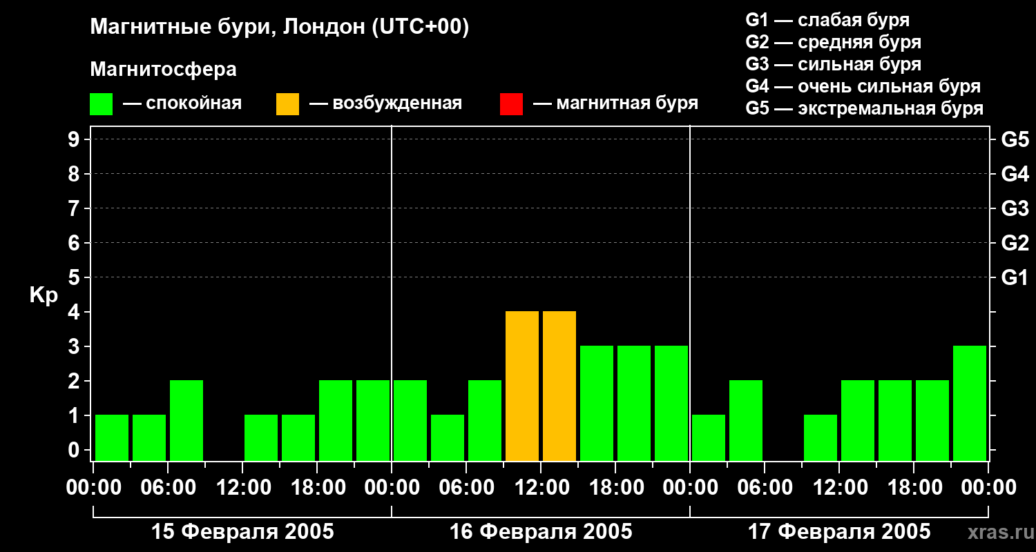 Изменения геомагнитного индекса Kp с 15 по 17 февраля 2005 года для средних широт