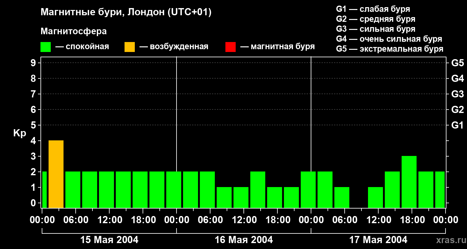 Изменения геомагнитного индекса Kp с 15 по 17 мая 2004 года для средних широт