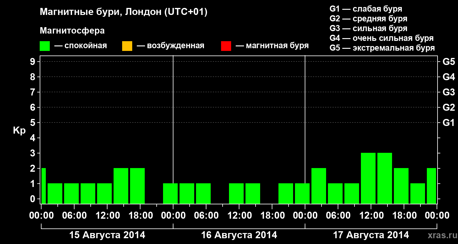 Изменения геомагнитного индекса Kp с 15 по 17 августа 2014 года для средних широт