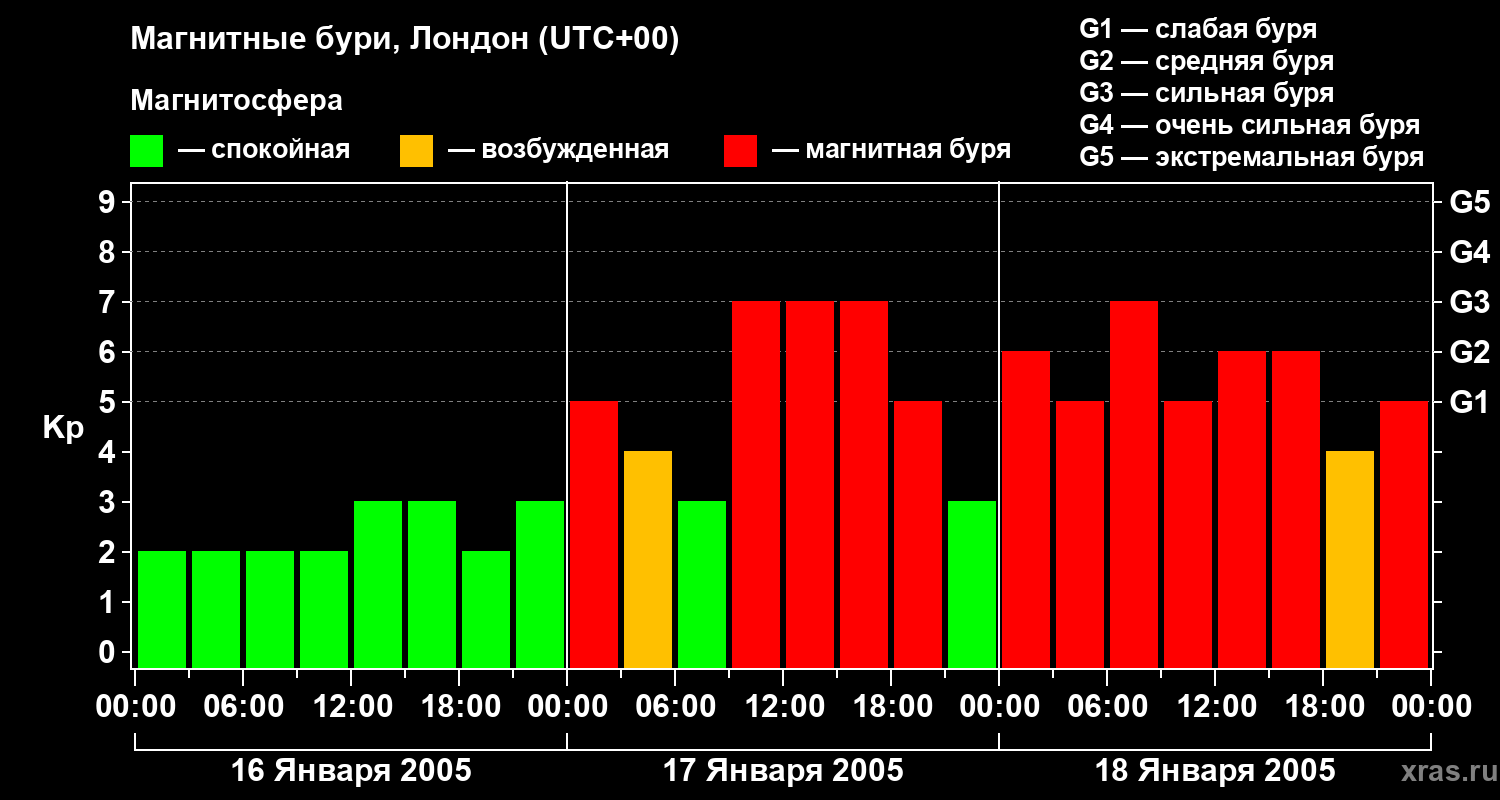 Изменения геомагнитного индекса Kp с 16 по 18 января 2005 года для средних широт