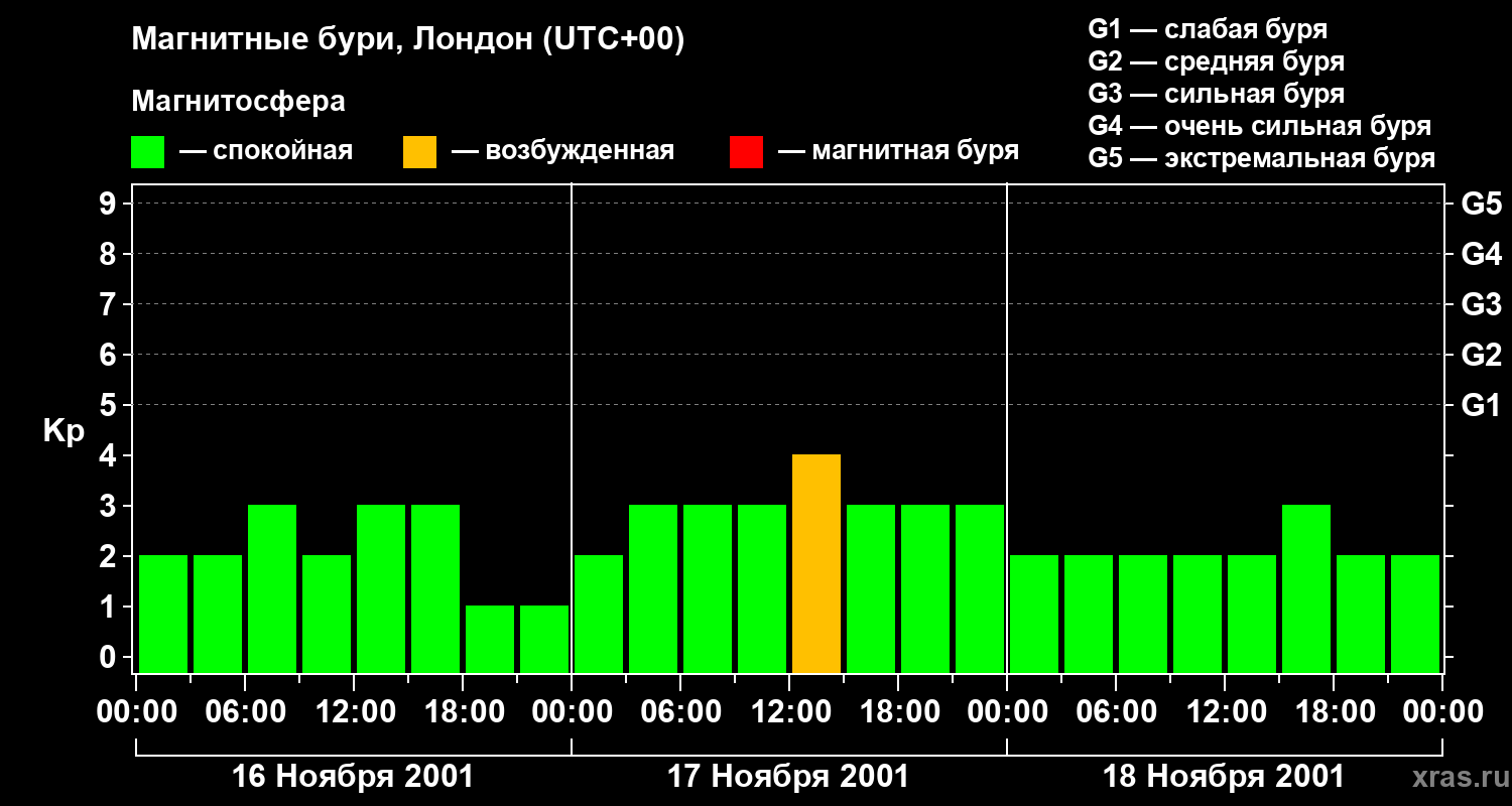 Изменения геомагнитного индекса Kp с 16 по 18 ноября 2001 года для средних широт