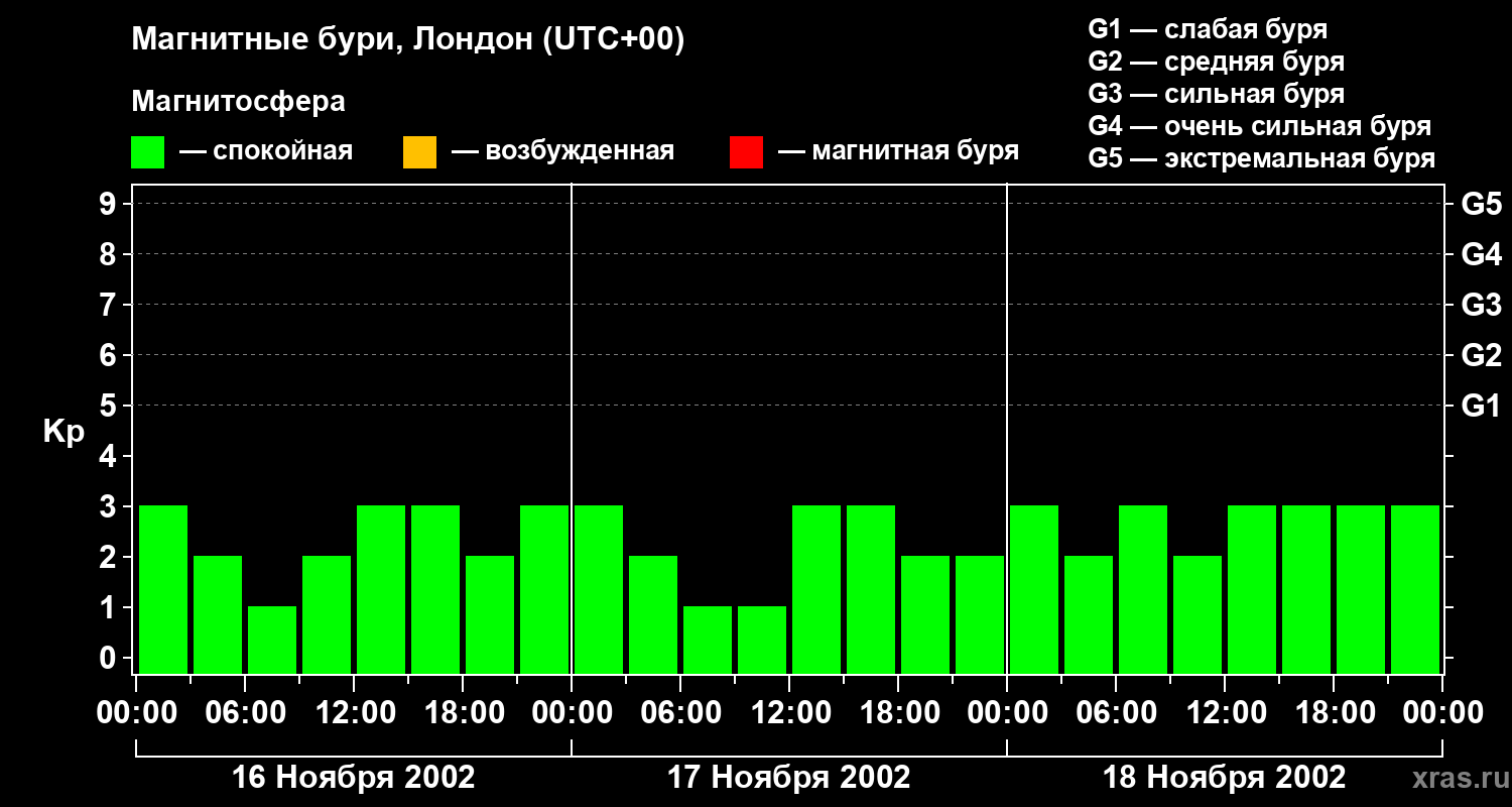 Изменения геомагнитного индекса Kp с 16 по 18 ноября 2002 года для средних широт