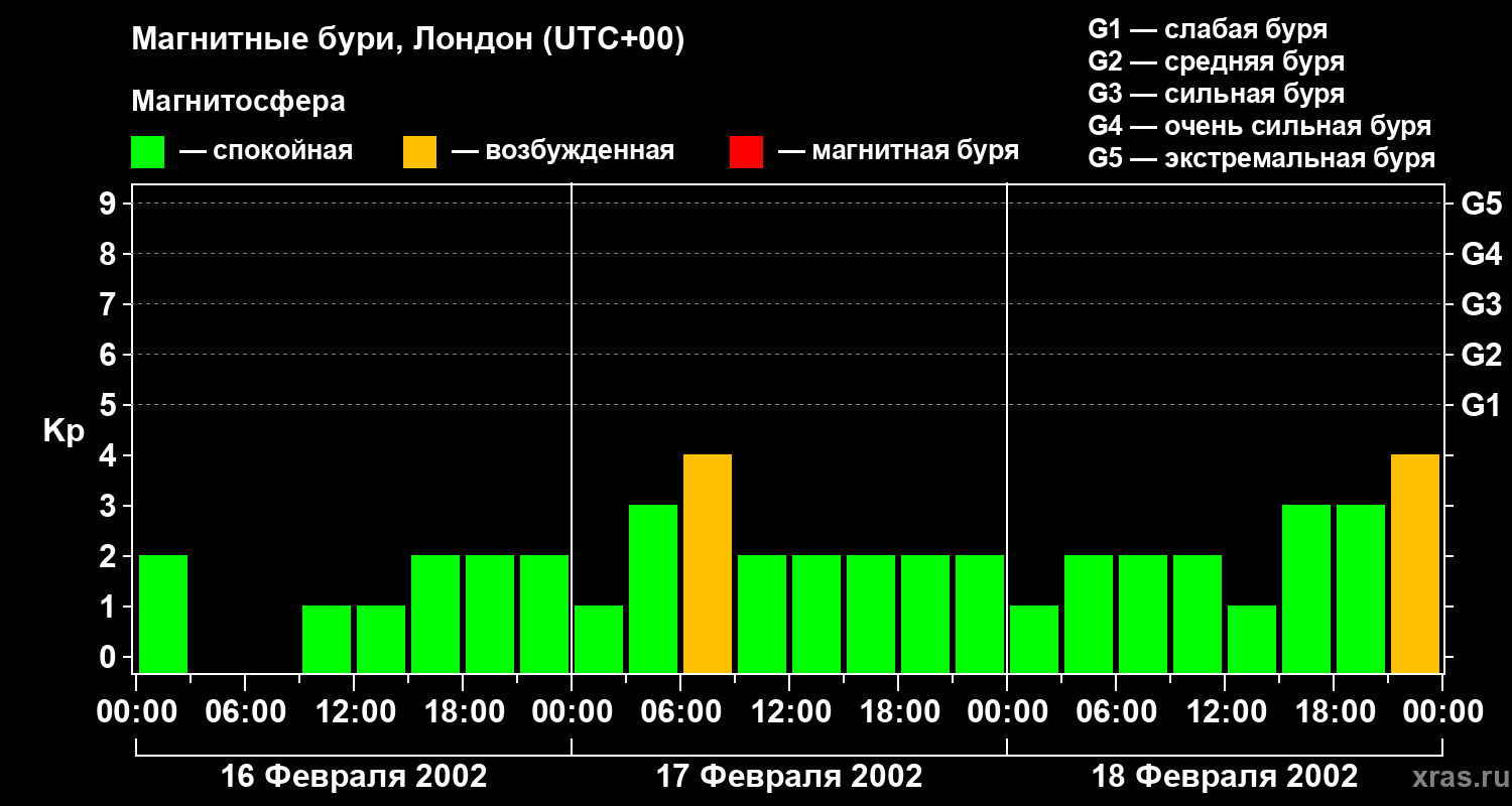 Изменения геомагнитного индекса Kp с 16 по 18 февраля 2002 года для средних широт