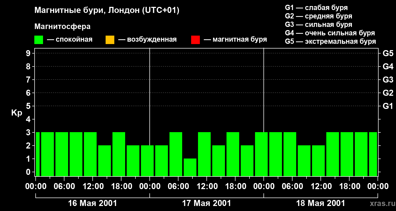 Изменения геомагнитного индекса Kp с 16 по 18 мая 2001 года для средних широт