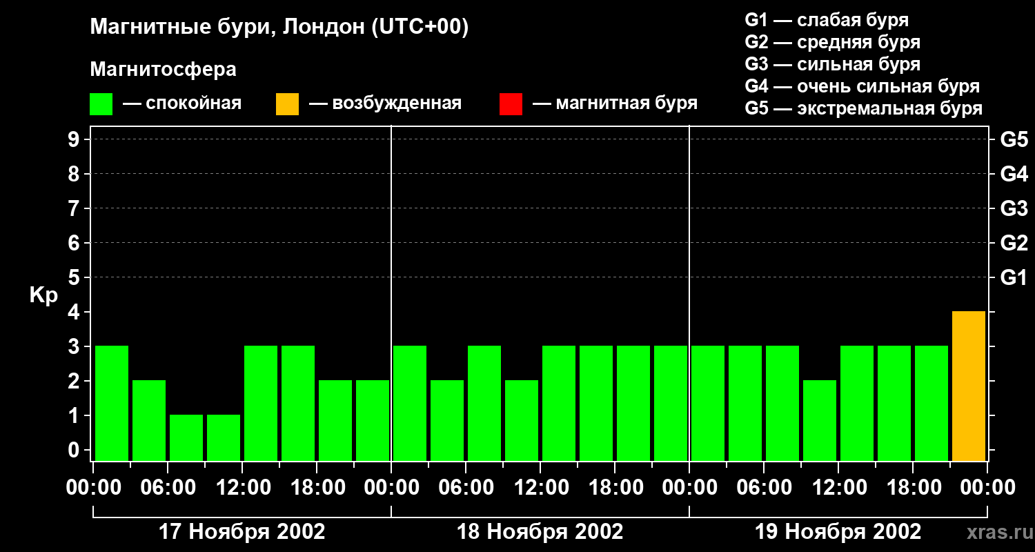 Изменения геомагнитного индекса Kp с 17 по 19 ноября 2002 года для средних широт