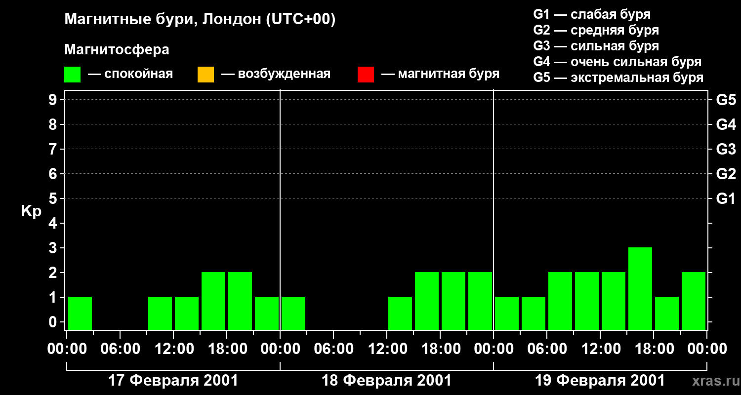 Изменения геомагнитного индекса Kp с 17 по 19 февраля 2001 года для средних широт