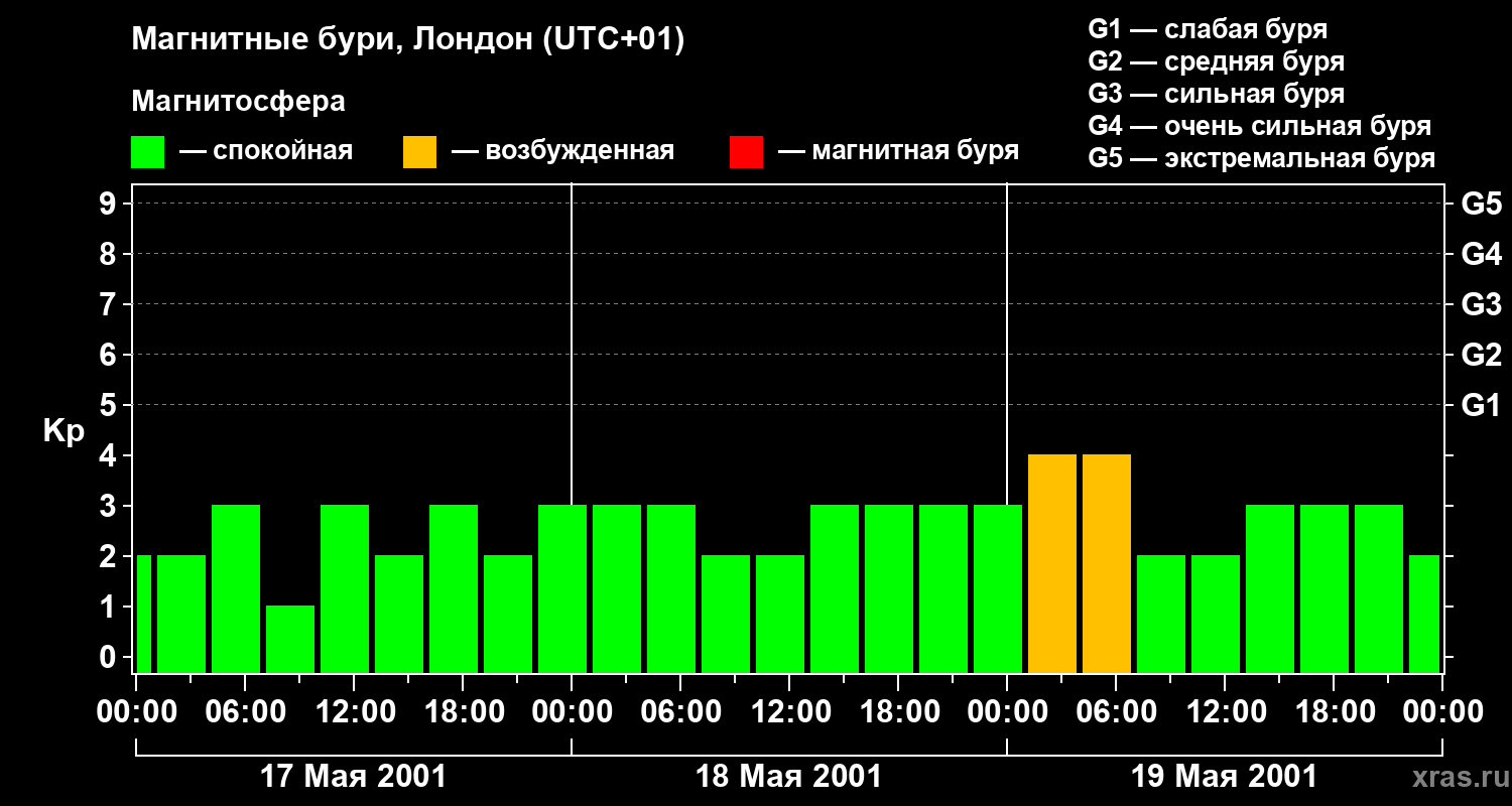 Изменения геомагнитного индекса Kp с 17 по 19 мая 2001 года для средних широт
