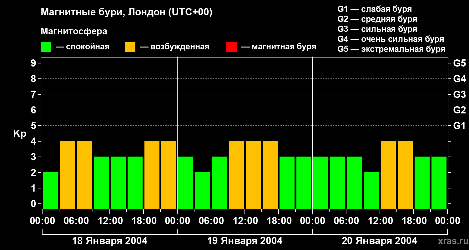 Изменения геомагнитного индекса Kp с 18 по 20 января 2004 года для средних широт