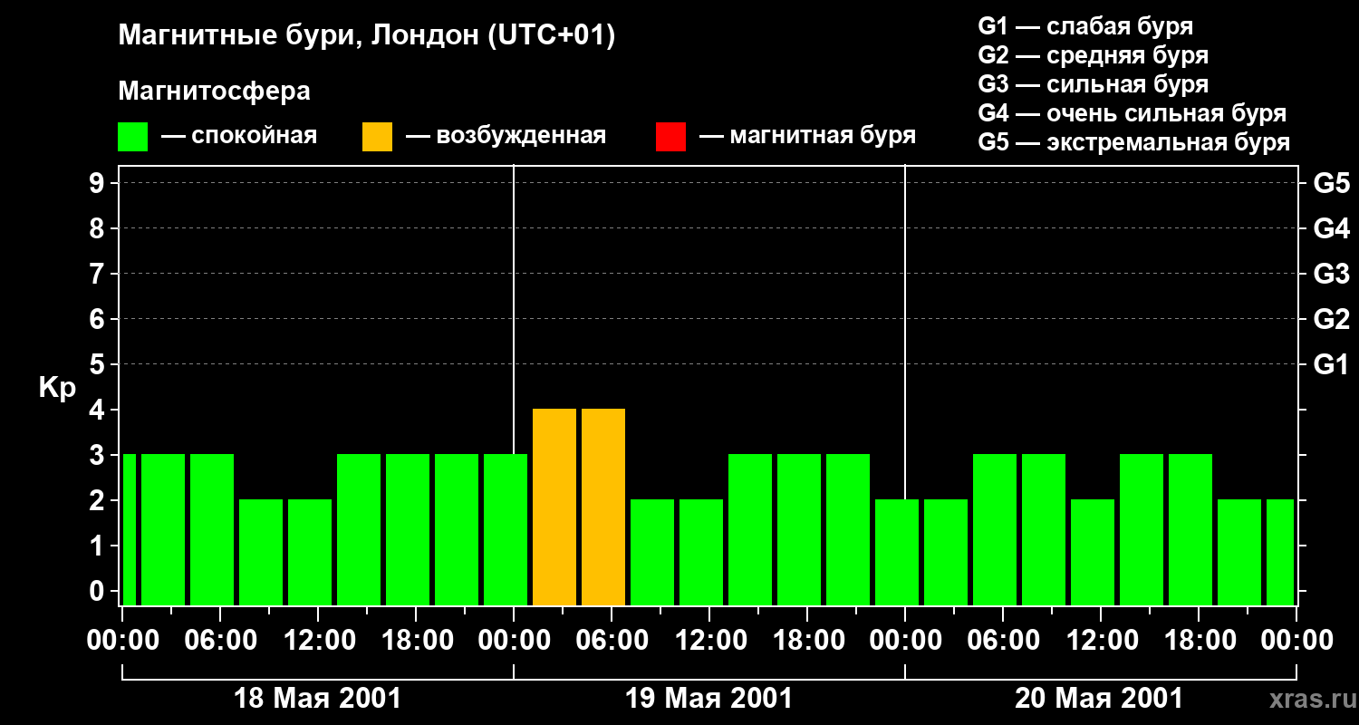 Изменения геомагнитного индекса Kp с 18 по 20 мая 2001 года для средних широт