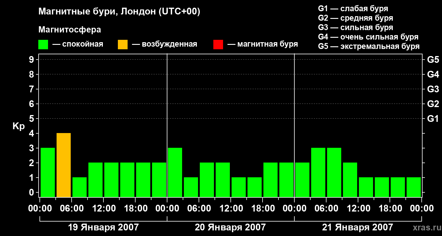 Изменения геомагнитного индекса Kp с 19 по 21 января 2007 года для средних широт
