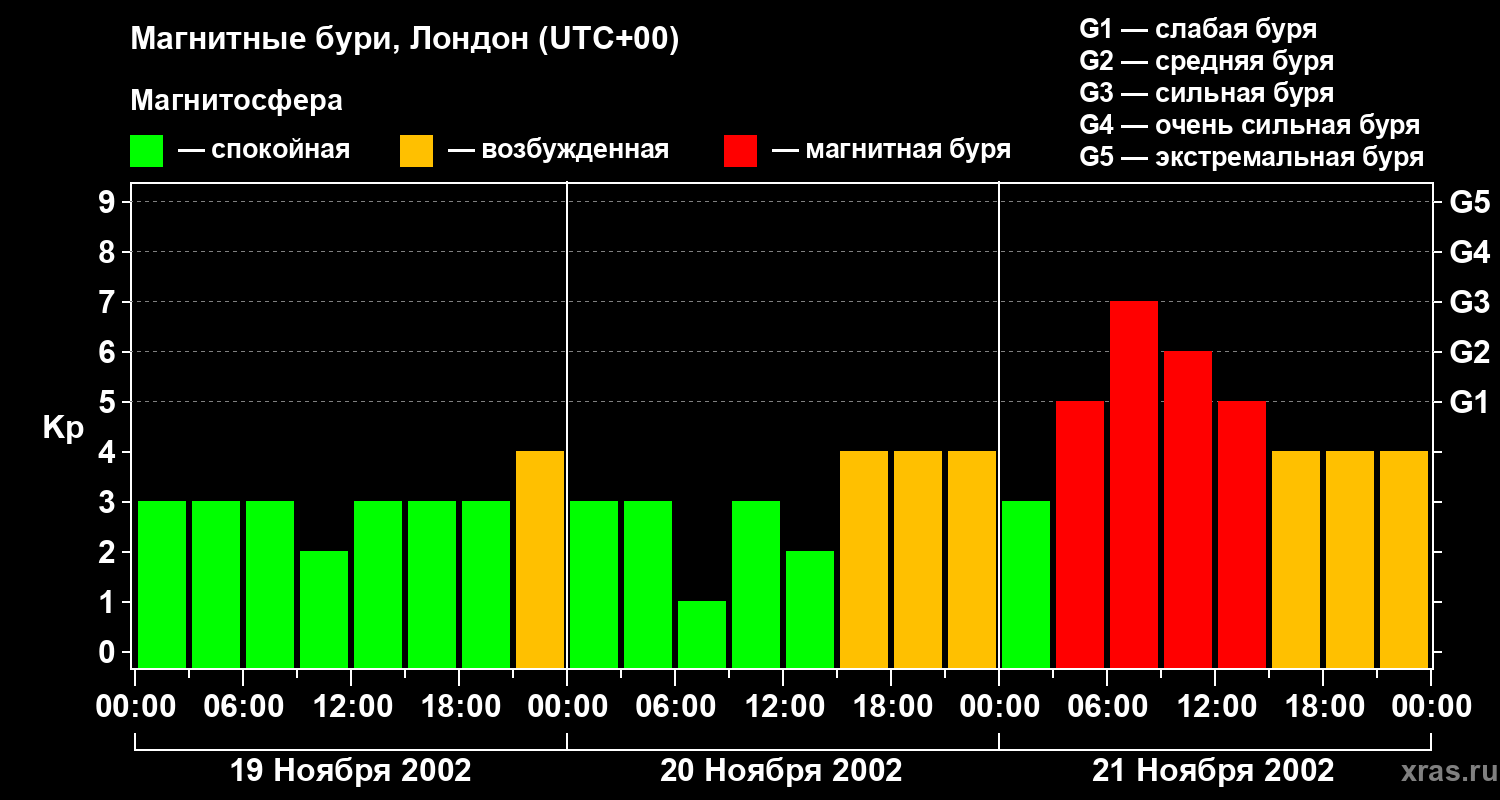 Изменения геомагнитного индекса Kp с 19 по 21 ноября 2002 года для средних широт