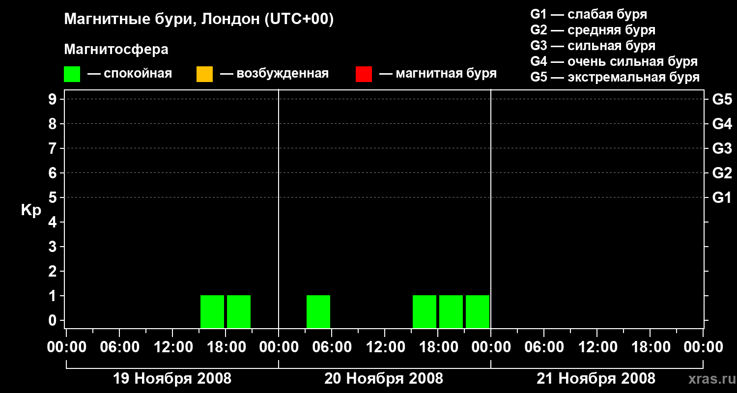 Изменения геомагнитного индекса Kp с 19 по 21 ноября 2008 года для средних широт