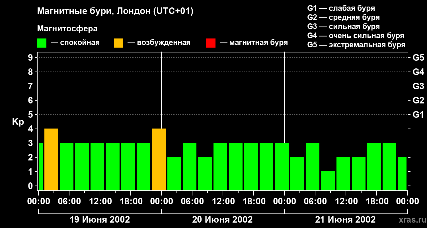 Изменения геомагнитного индекса Kp с 19 по 21 июня 2002 года для средних широт