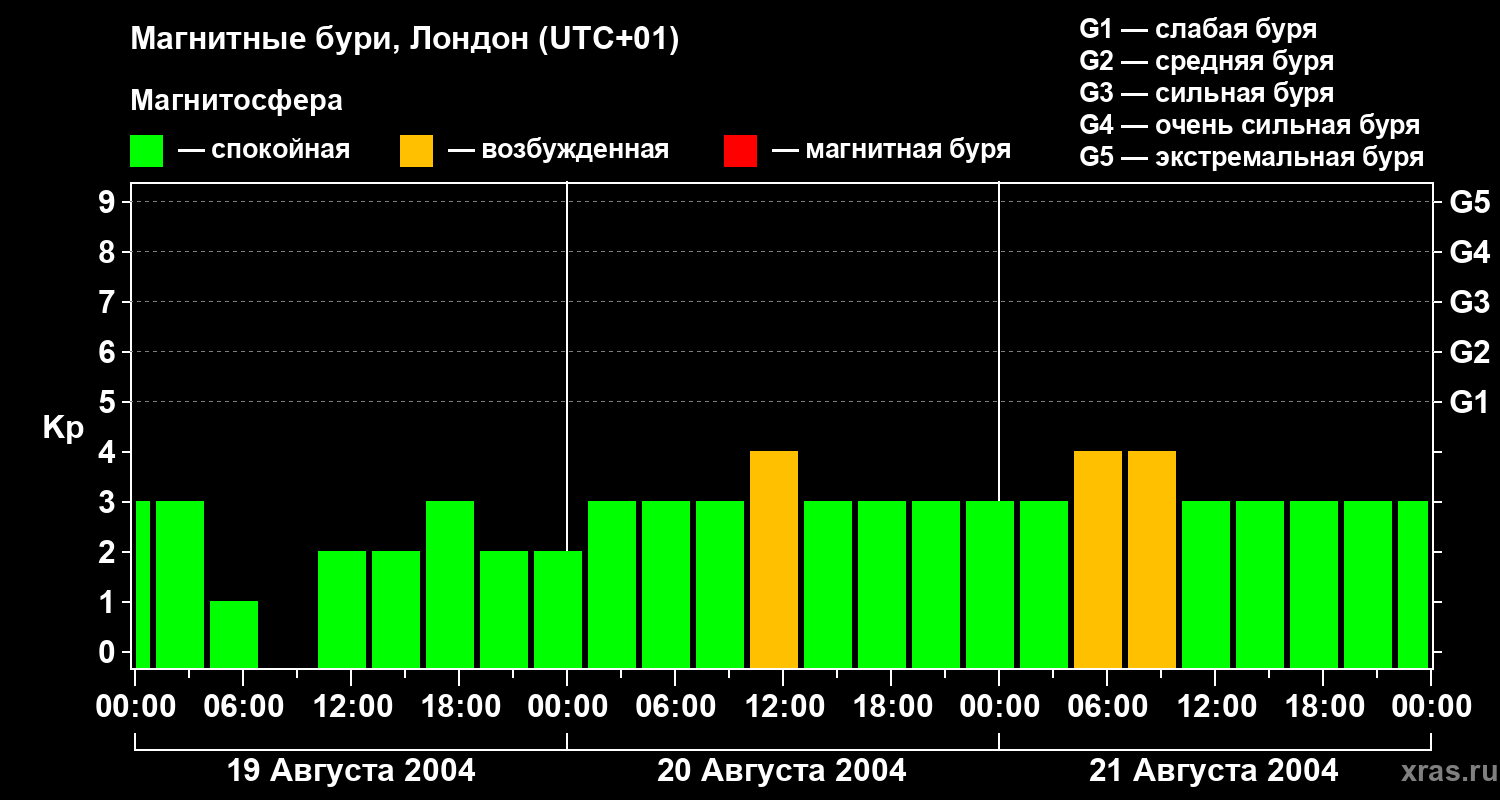 Изменения геомагнитного индекса Kp с 19 по 21 августа 2004 года для средних широт