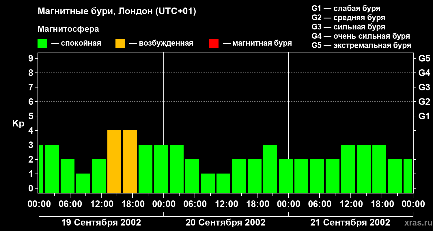 Изменения геомагнитного индекса Kp с 19 по 21 сентября 2002 года для средних широт