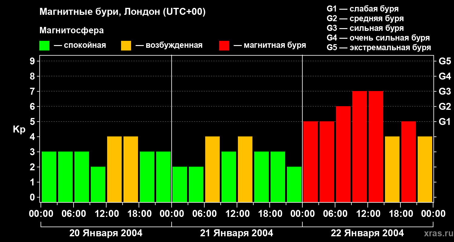 Изменения геомагнитного индекса Kp с 20 по 22 января 2004 года для средних широт