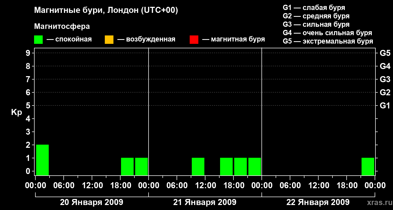 Изменения геомагнитного индекса Kp с 20 по 22 января 2009 года для средних широт