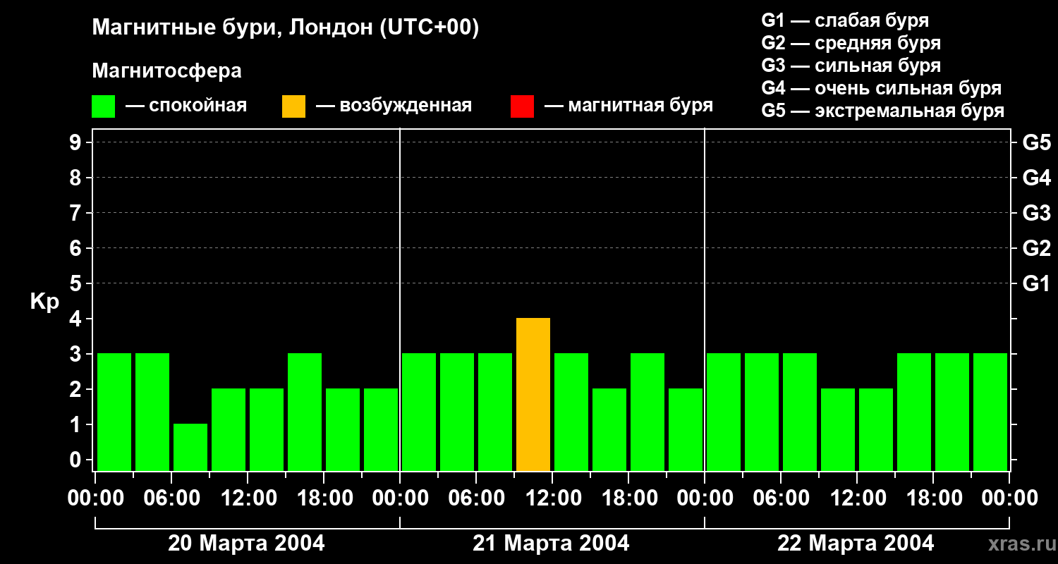Изменения геомагнитного индекса Kp с 20 по 22 марта 2004 года для средних широт