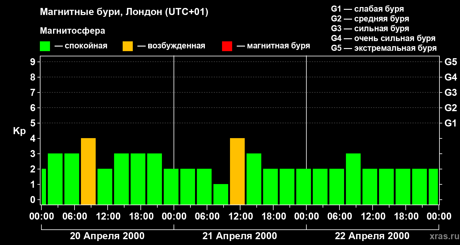 Изменения геомагнитного индекса Kp с 20 по 22 апреля 2000 года для средних широт