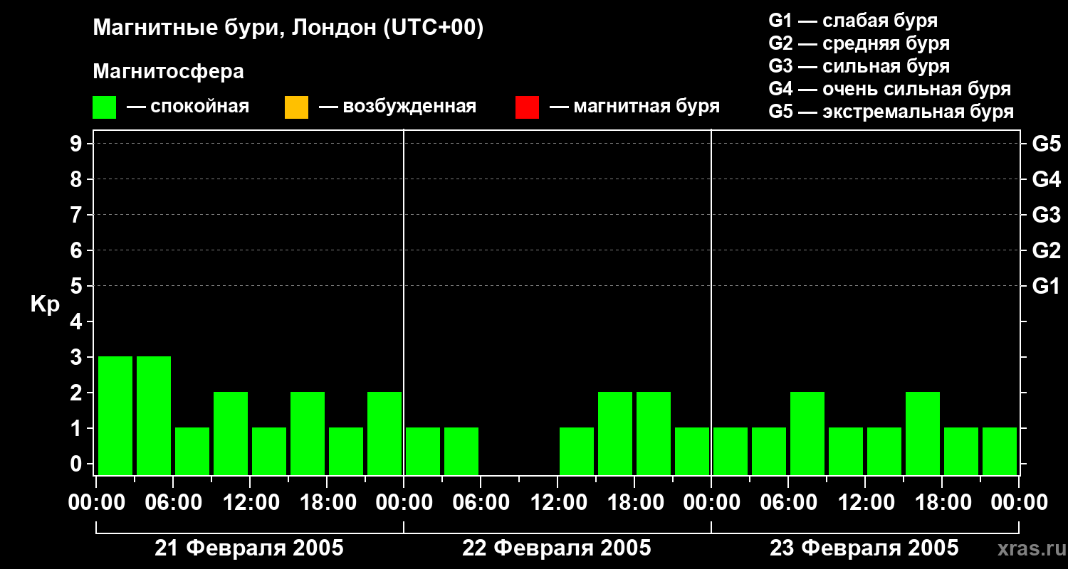 Изменения геомагнитного индекса Kp с 21 по 23 февраля 2005 года для средних широт