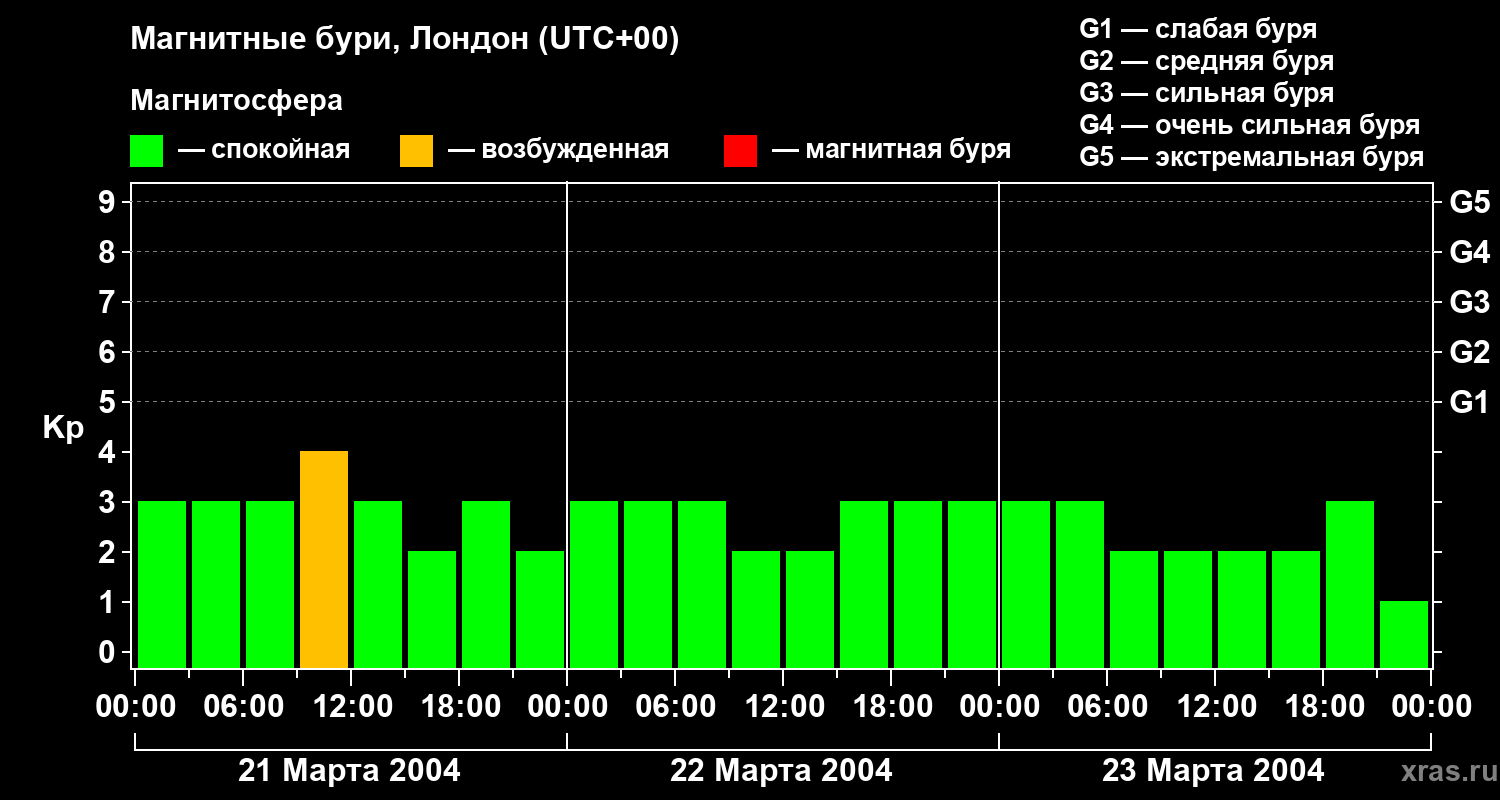 Изменения геомагнитного индекса Kp с 21 по 23 марта 2004 года для средних широт
