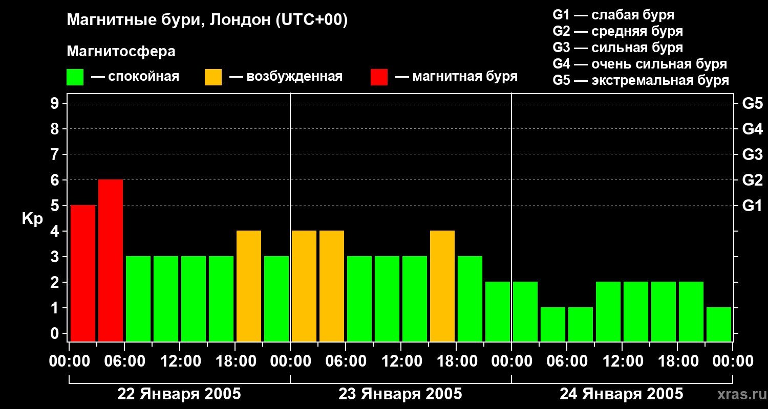 Изменения геомагнитного индекса Kp с 22 по 24 января 2005 года для средних широт