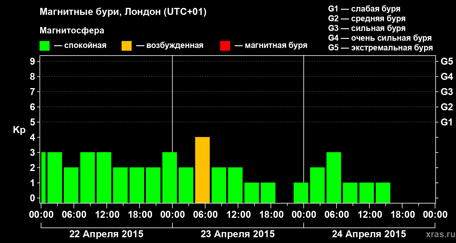 Изменения геомагнитного индекса Kp с 22 по 24 апреля 2015 года для средних широт