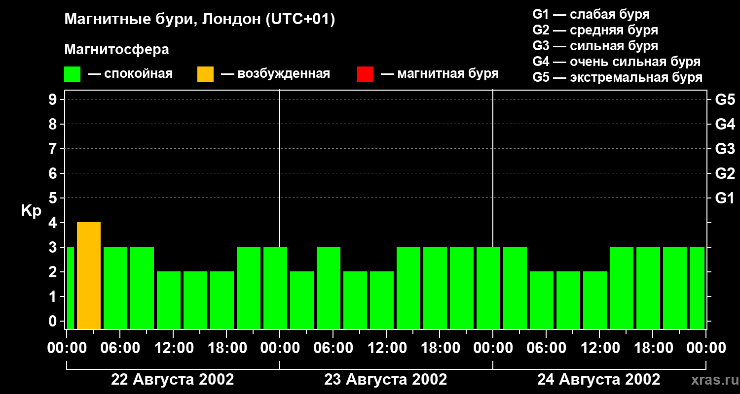 Изменения геомагнитного индекса Kp с 22 по 24 августа 2002 года для средних широт