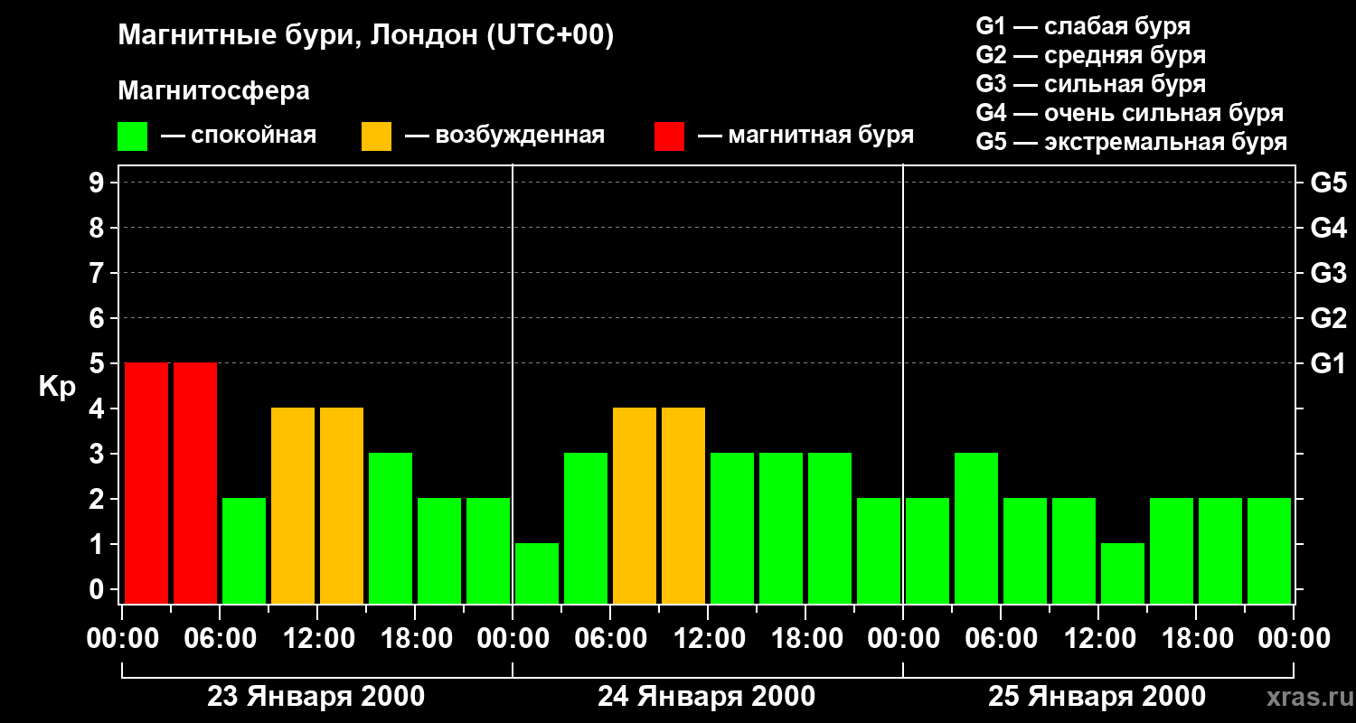 Изменения геомагнитного индекса Kp с 23 по 25 января 2000 года для средних широт
