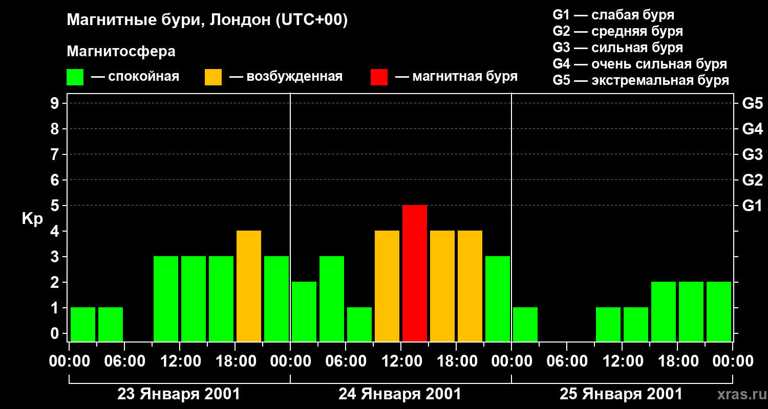 Изменения геомагнитного индекса Kp с 23 по 25 января 2001 года для средних широт