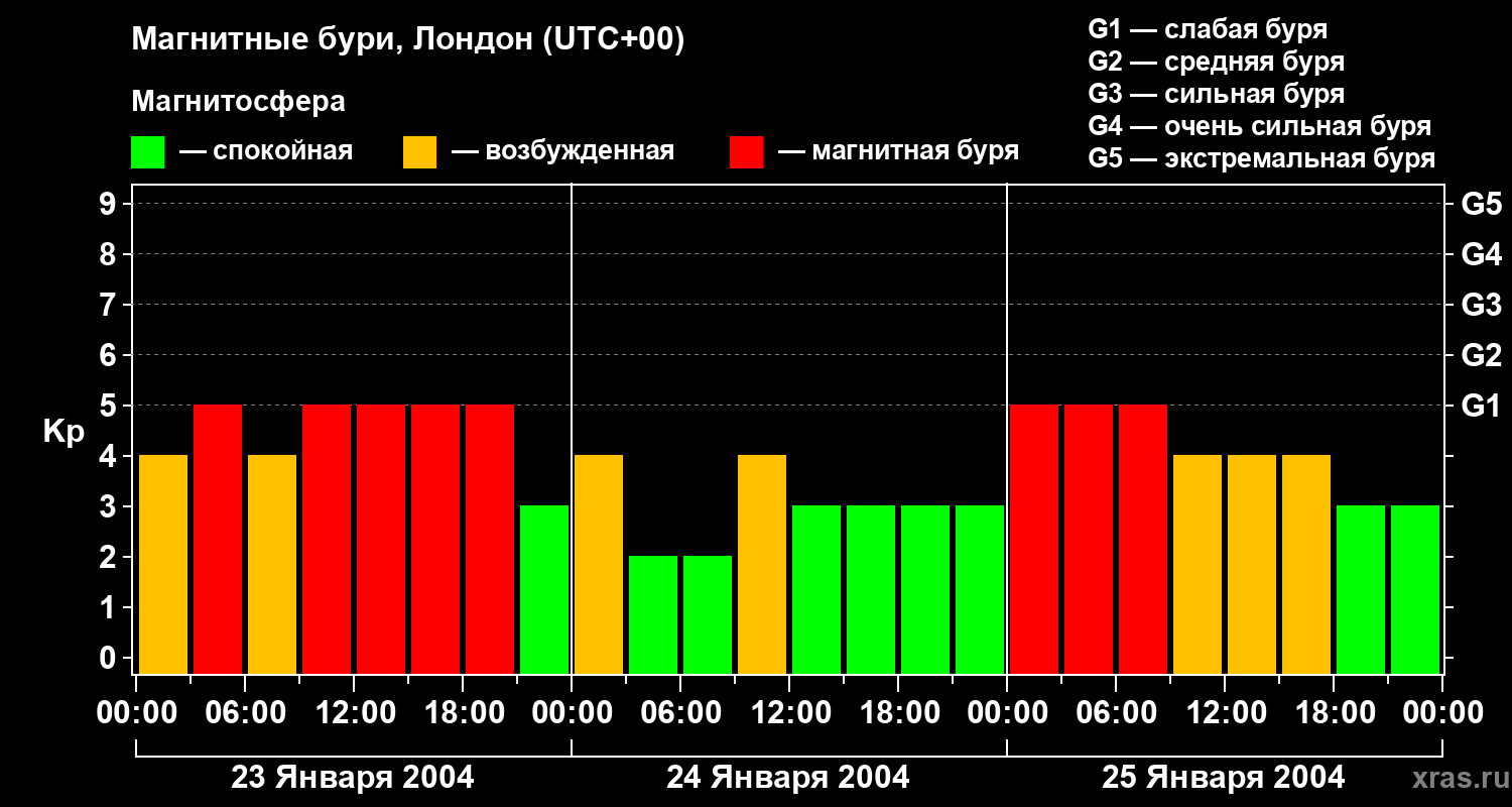 Изменения геомагнитного индекса Kp с 23 по 25 января 2004 года для средних широт