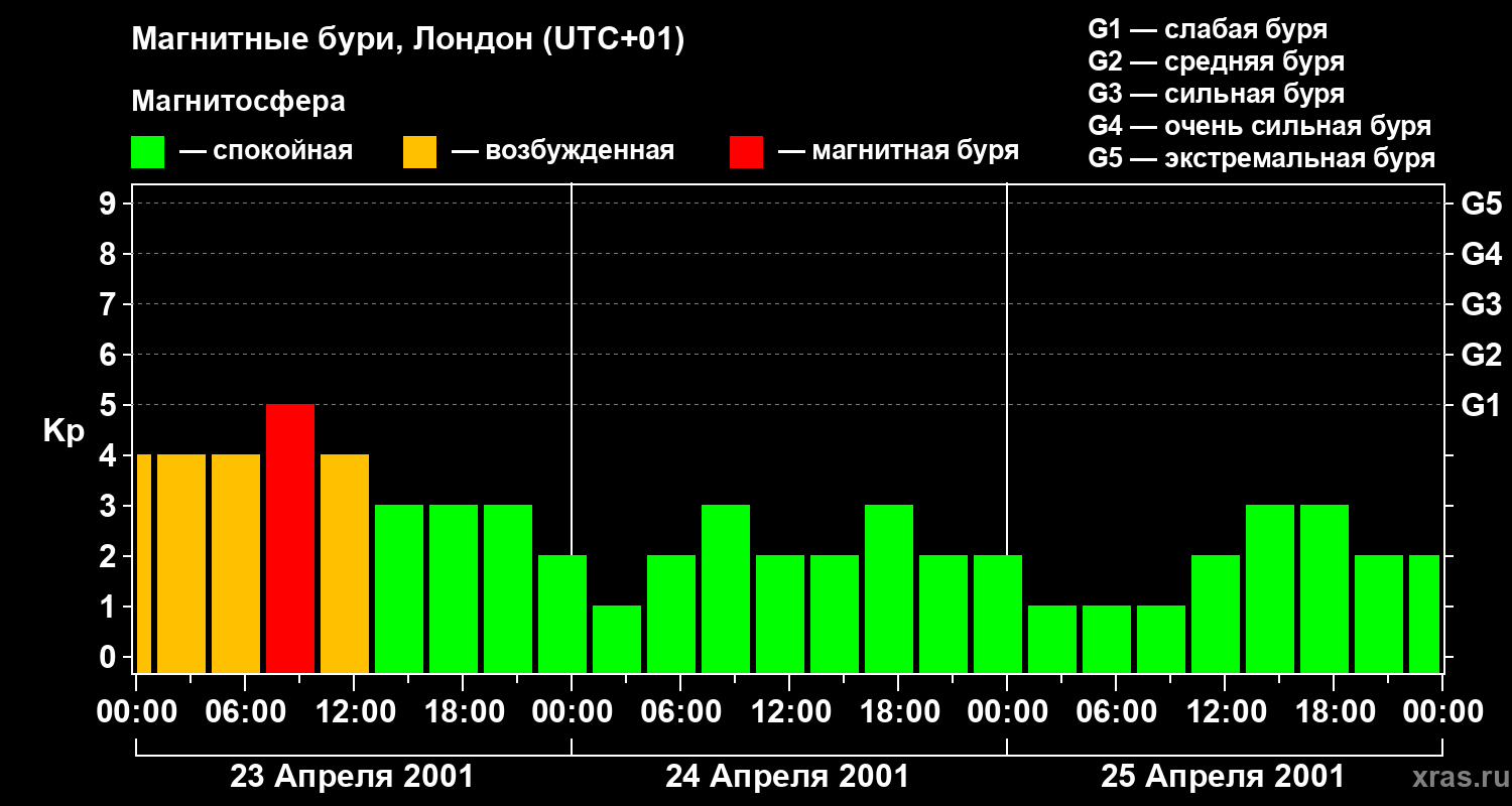 Изменения геомагнитного индекса Kp с 23 по 25 апреля 2001 года для средних широт