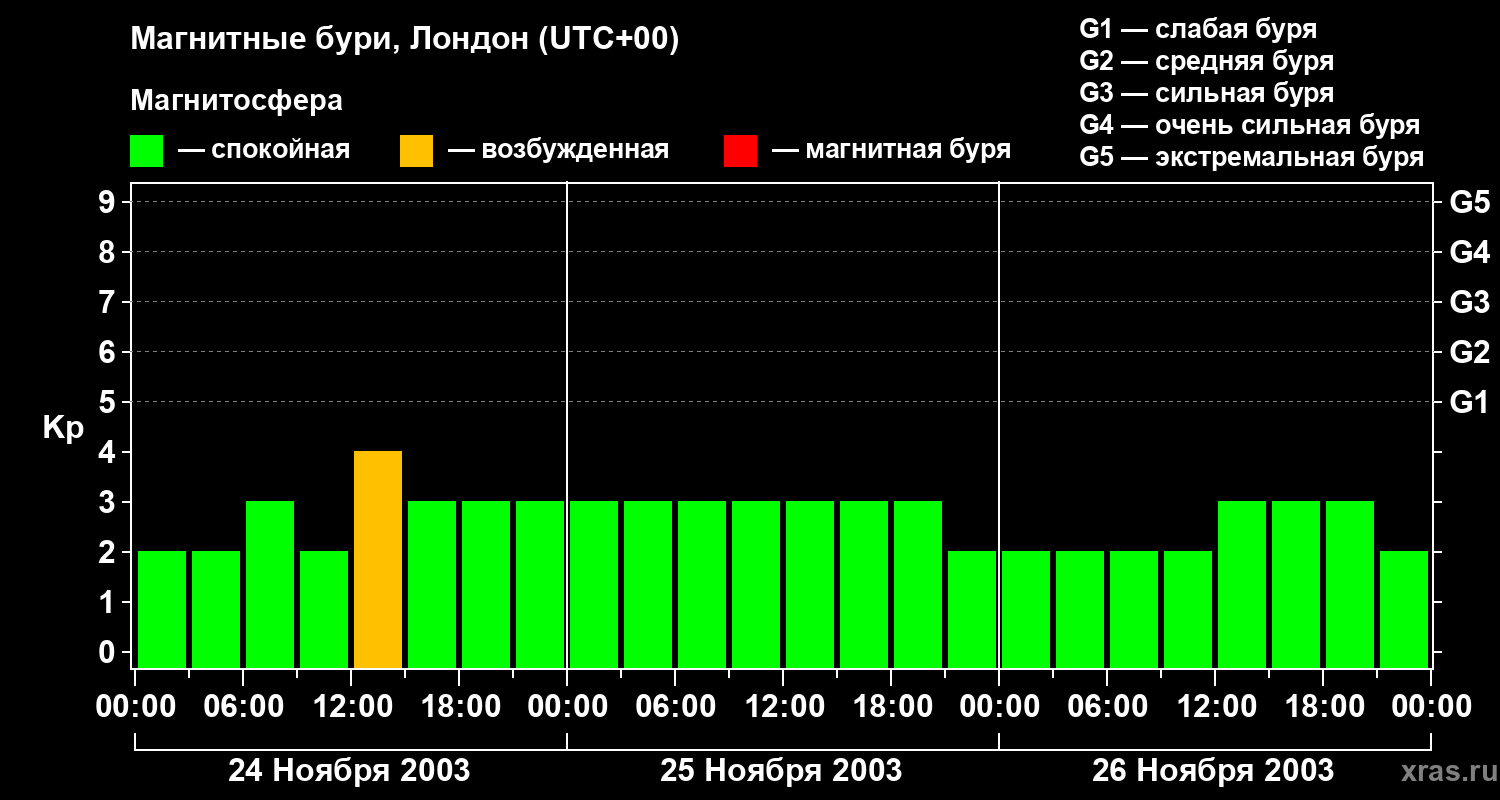 Изменения геомагнитного индекса Kp с 24 по 26 ноября 2003 года для средних широт