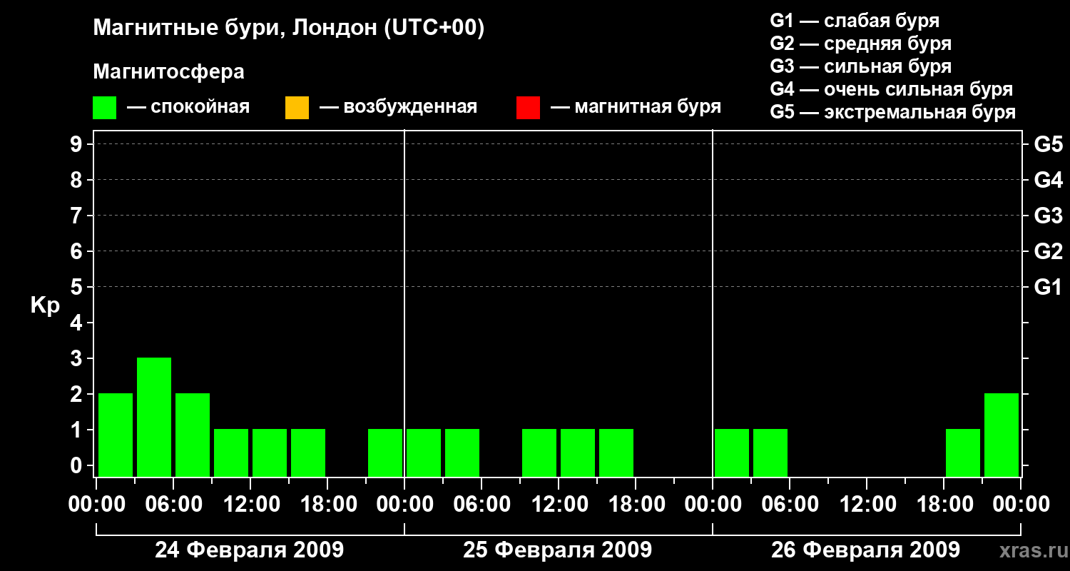 Изменения геомагнитного индекса Kp с 24 по 26 февраля 2009 года для средних широт