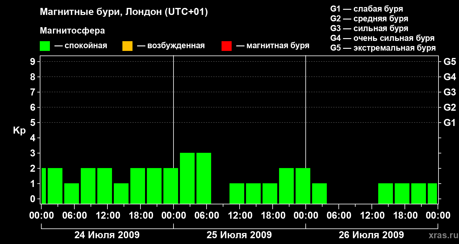 Изменения геомагнитного индекса Kp с 24 по 26 июля 2009 года для средних широт
