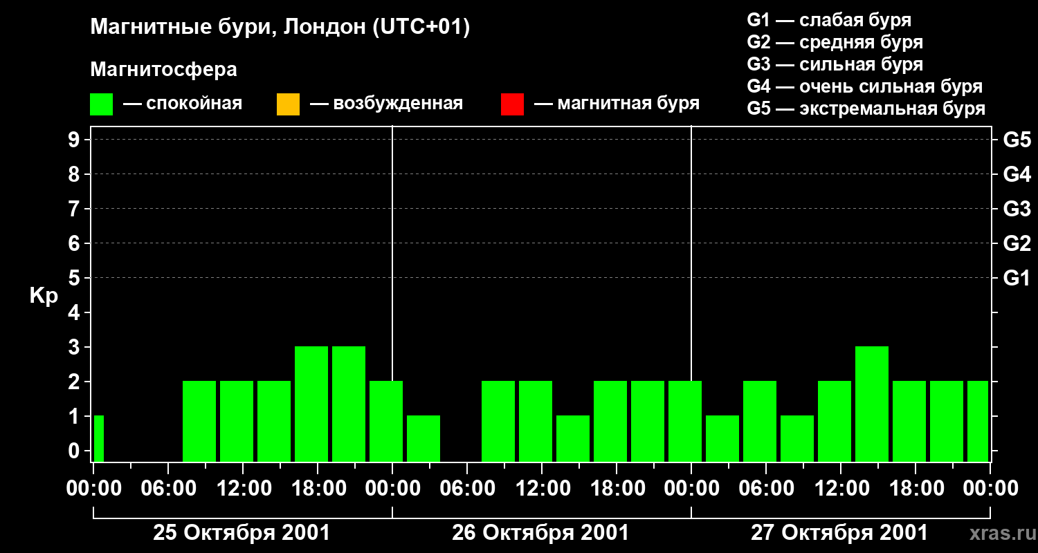 Изменения геомагнитного индекса Kp с 25 по 27 октября 2001 года для средних широт