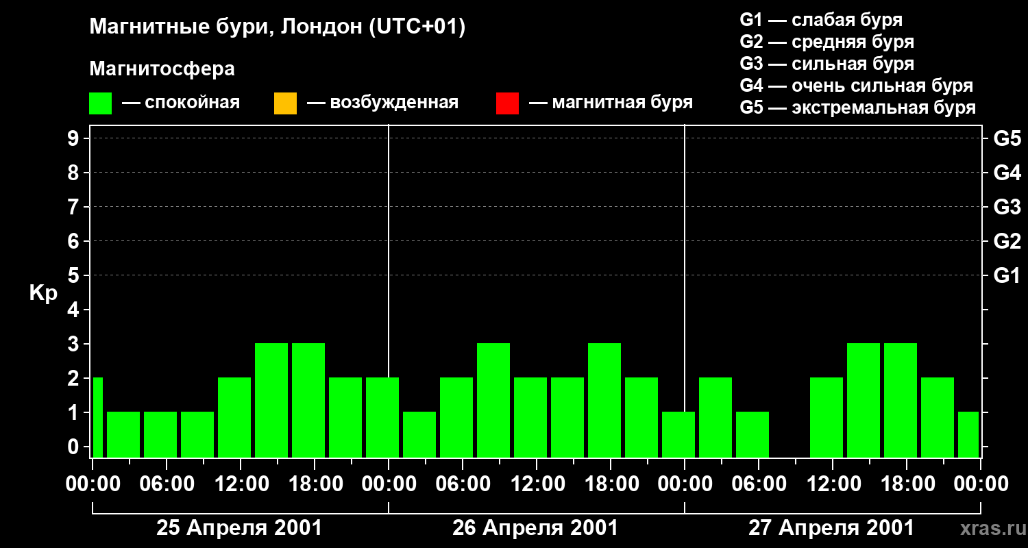 Изменения геомагнитного индекса Kp с 25 по 27 апреля 2001 года для средних широт
