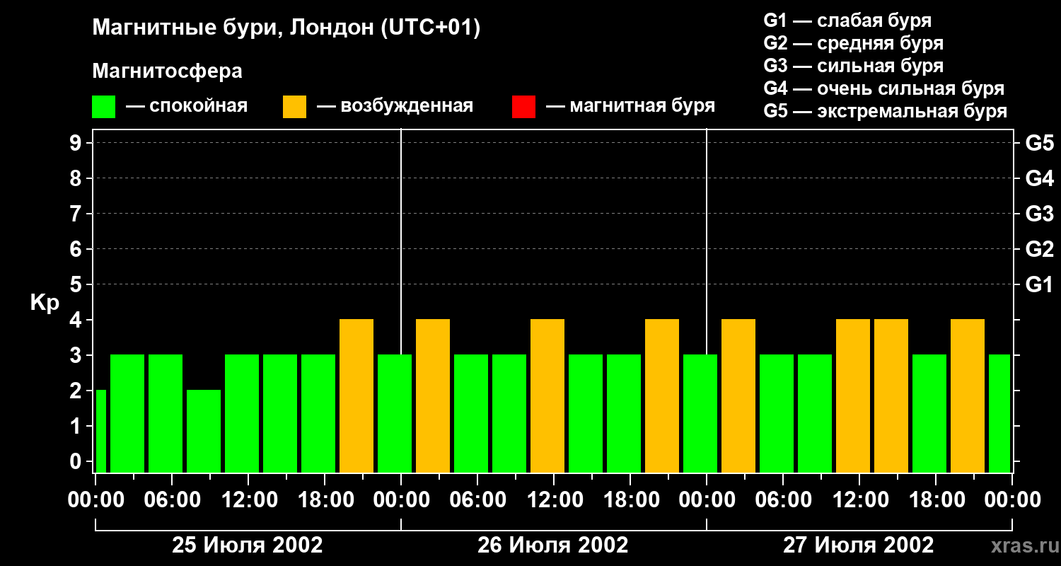 Изменения геомагнитного индекса Kp с 25 по 27 июля 2002 года для средних широт