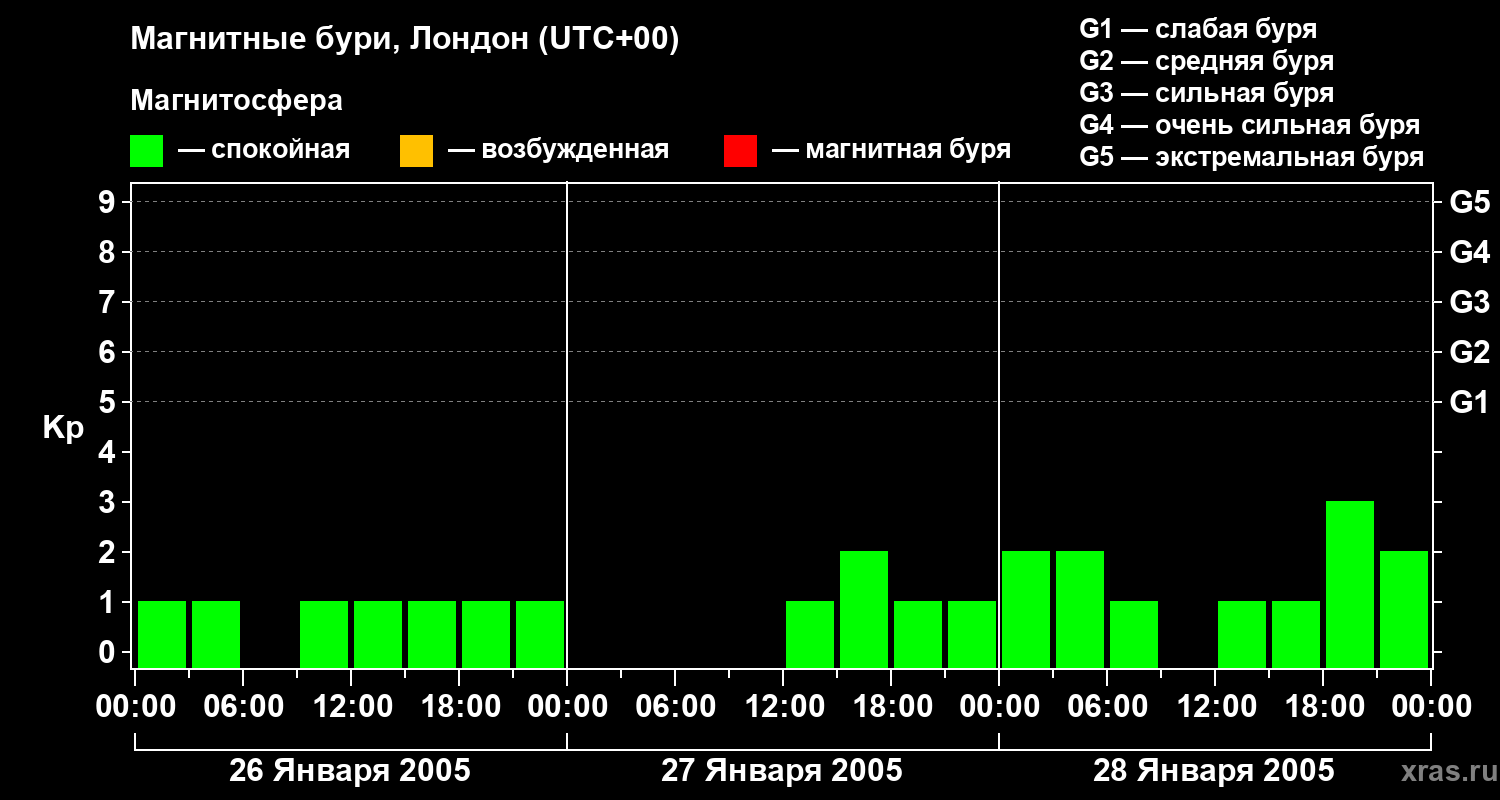 Изменения геомагнитного индекса Kp с 26 по 28 января 2005 года для средних широт