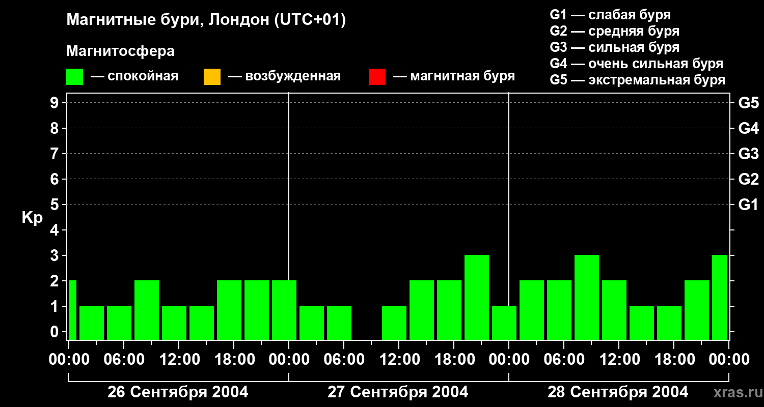 Изменения геомагнитного индекса Kp с 26 по 28 сентября 2004 года для средних широт