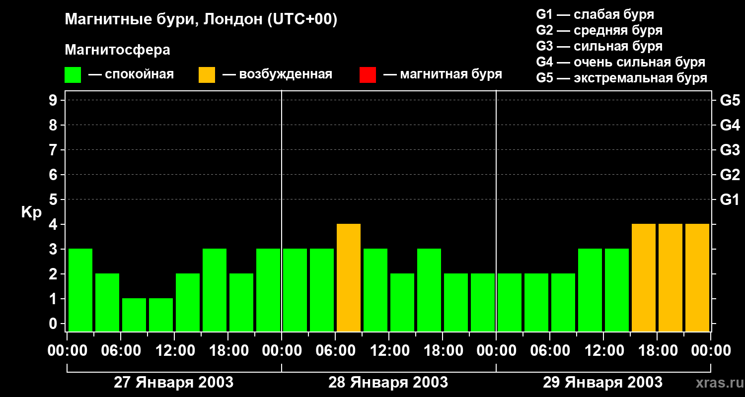 Изменения геомагнитного индекса Kp с 27 по 29 января 2003 года для средних широт