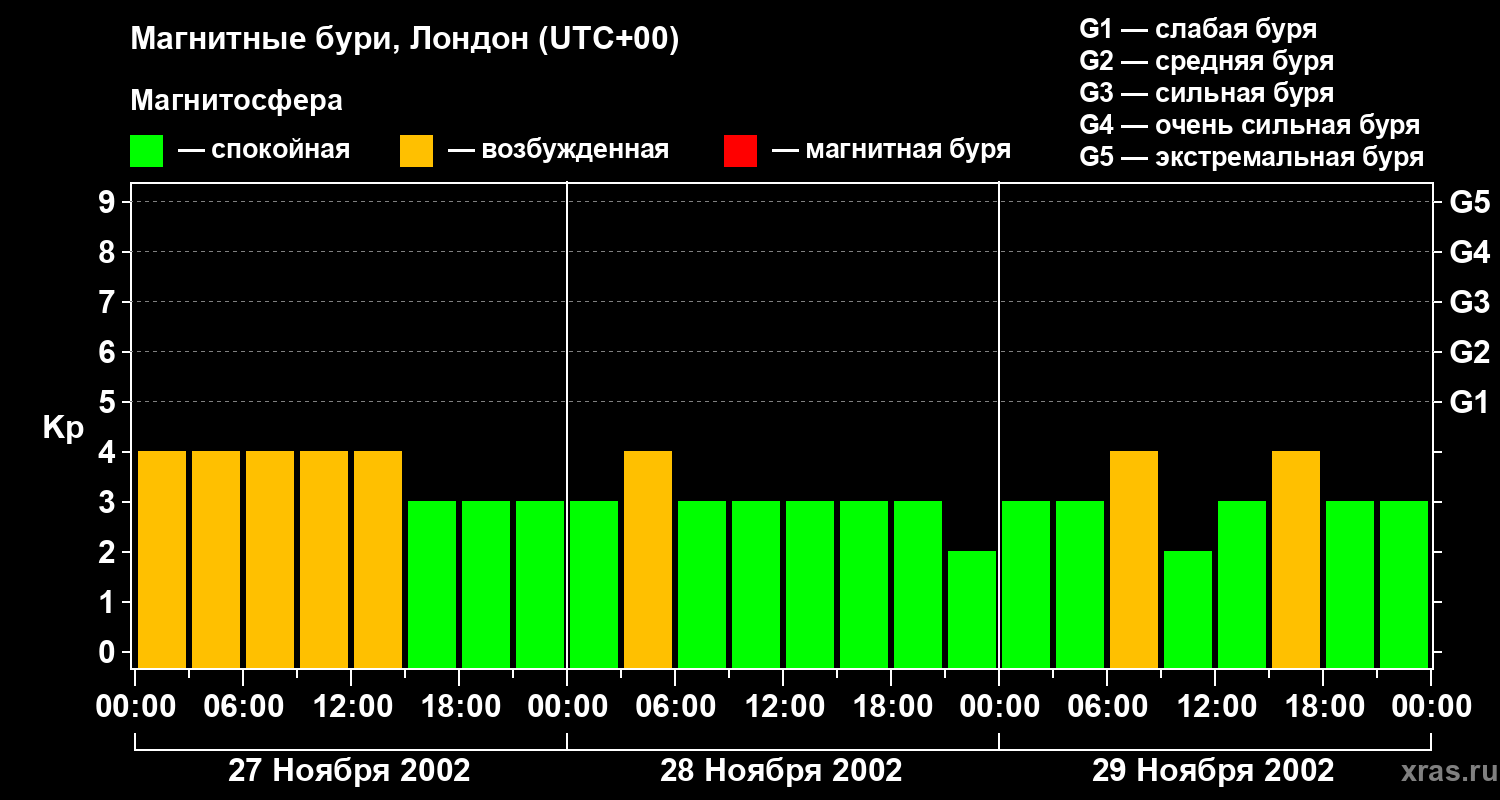 Изменения геомагнитного индекса Kp с 27 по 29 ноября 2002 года для средних широт