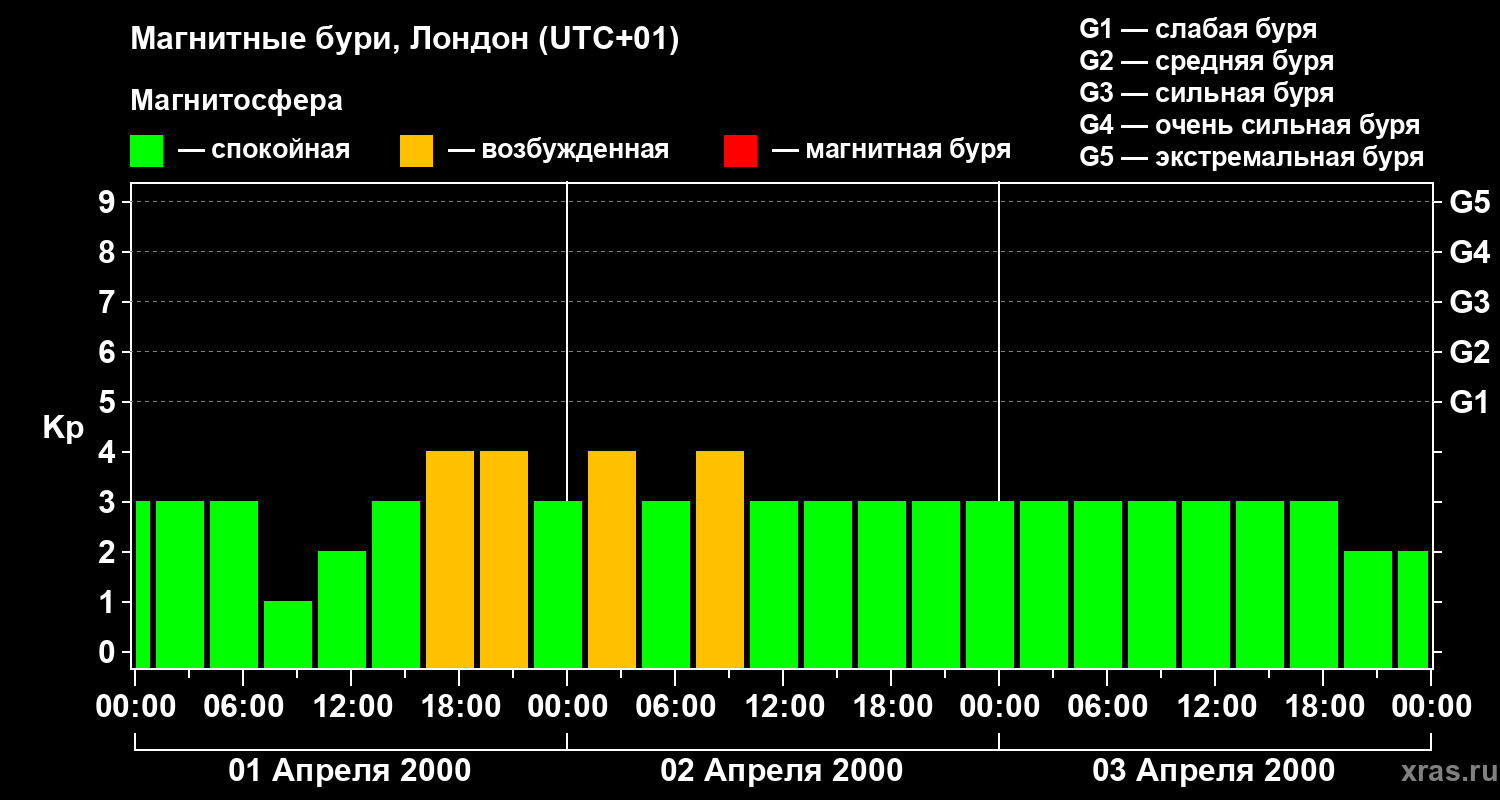 Изменения геомагнитного индекса Kp с 1 по 3 апреля 2000 года для средних широт