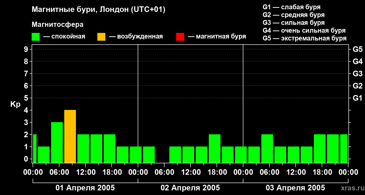 Изменения геомагнитного индекса Kp с 1 по 3 апреля 2005 года для средних широт