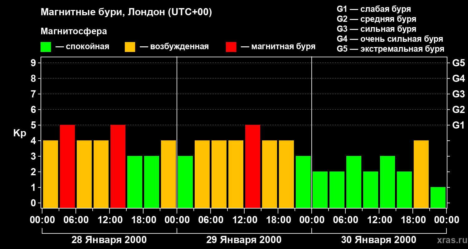 Изменения геомагнитного индекса Kp с 28 по 30 января 2000 года для средних широт