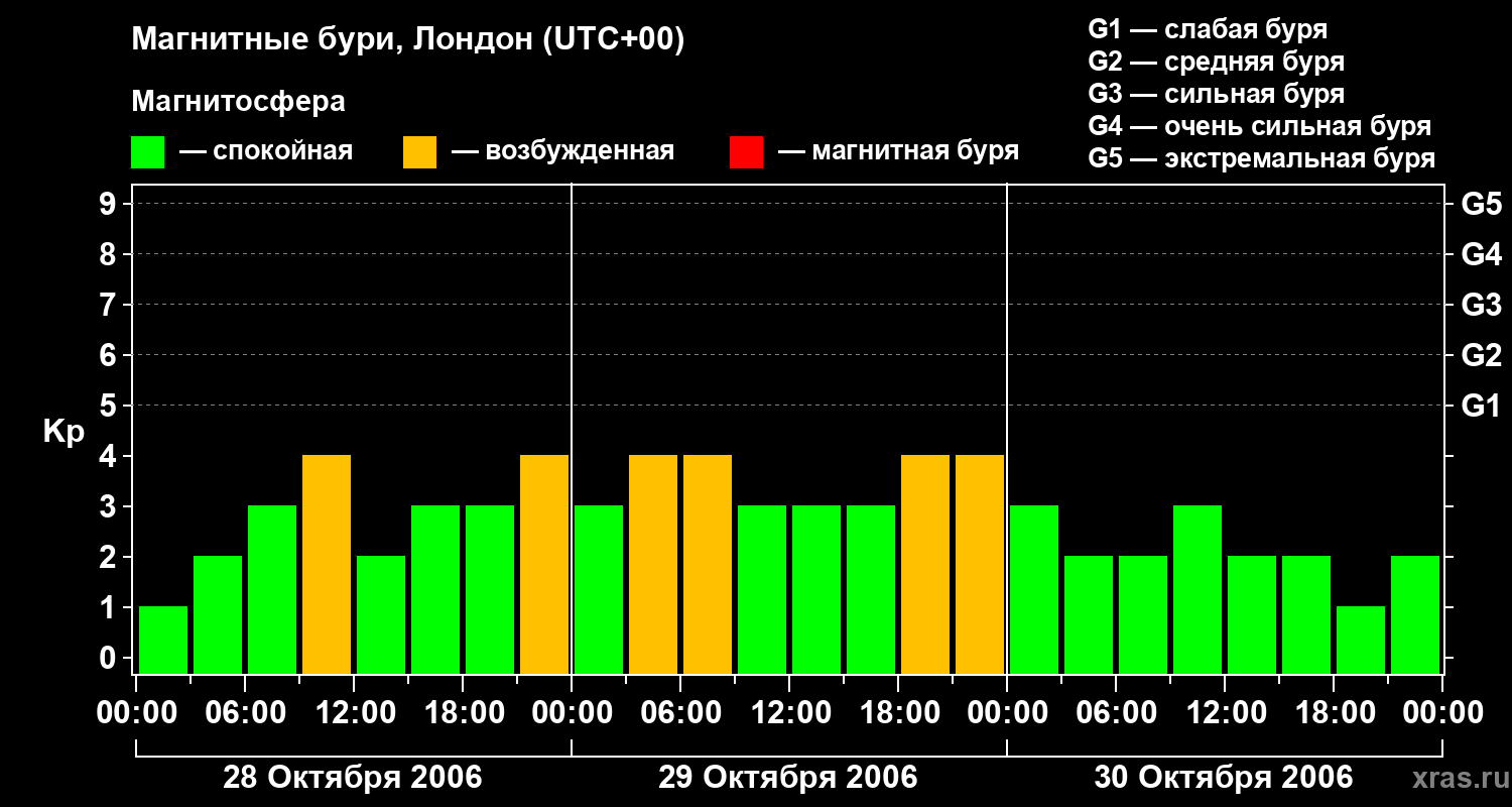 Изменения геомагнитного индекса Kp с 28 по 30 октября 2006 года для средних широт