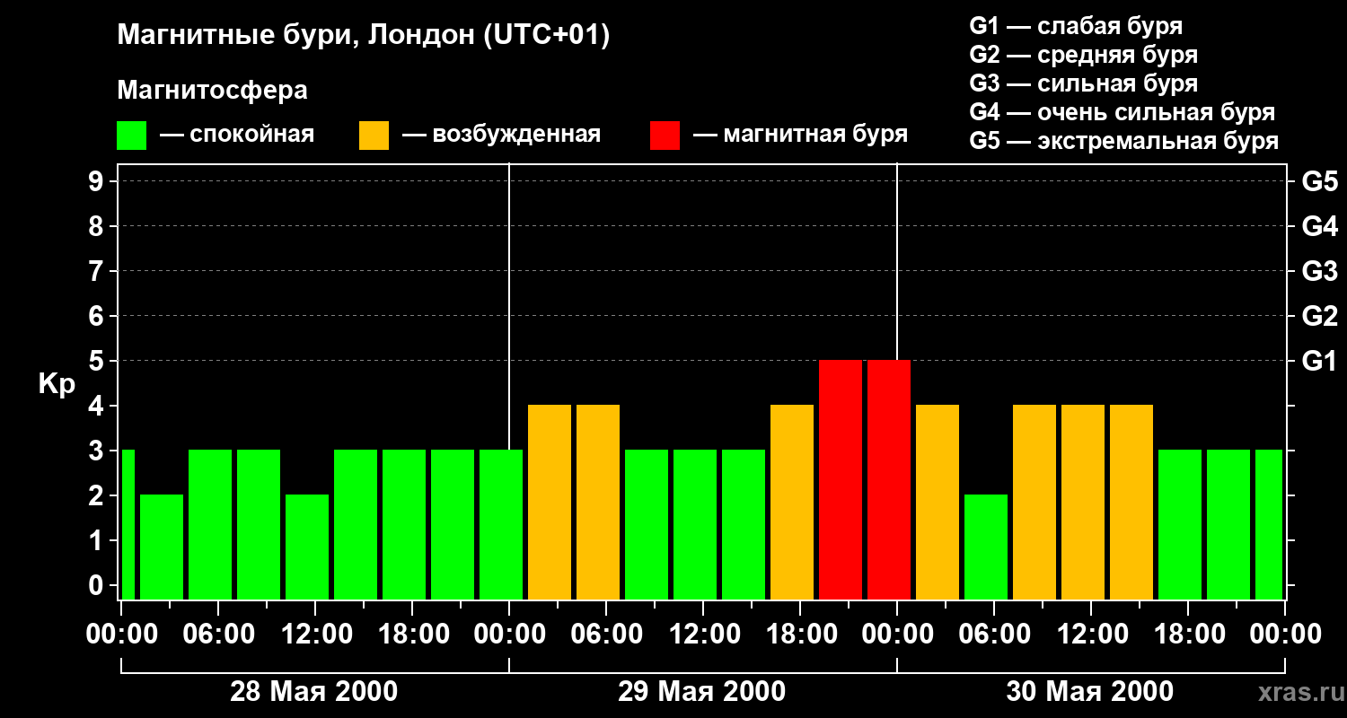 Изменения геомагнитного индекса Kp с 28 по 30 мая 2000 года для средних широт