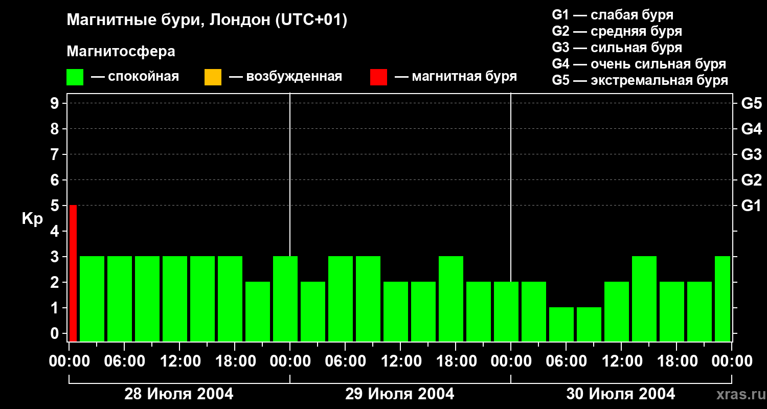Изменения геомагнитного индекса Kp с 28 по 30 июля 2004 года для средних широт